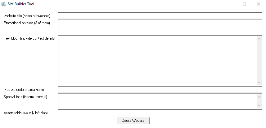 To create a complete new website, just fill in the form on the relevant Site Builder Tool The screenshot below shows the simple site builder tool - the gallery site builder is quite similar.